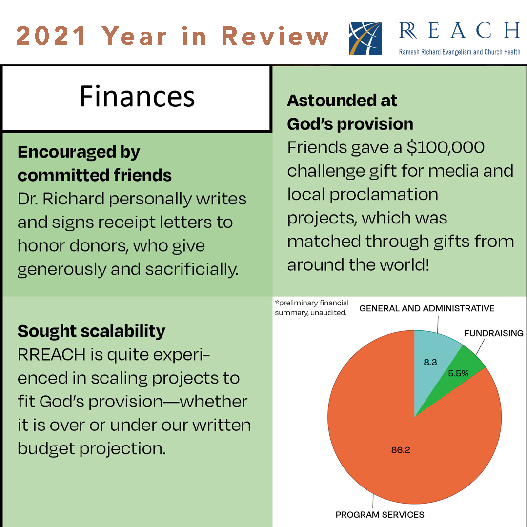 - PREACHERREACH graduate: RREACH also began implementing virtual PREACHERREACH academies to reach out to new pastors and leaders all around the world. Five PREACHERREACH Academies in Spanish, French, Portuguese and English graduated 144 in 2021.